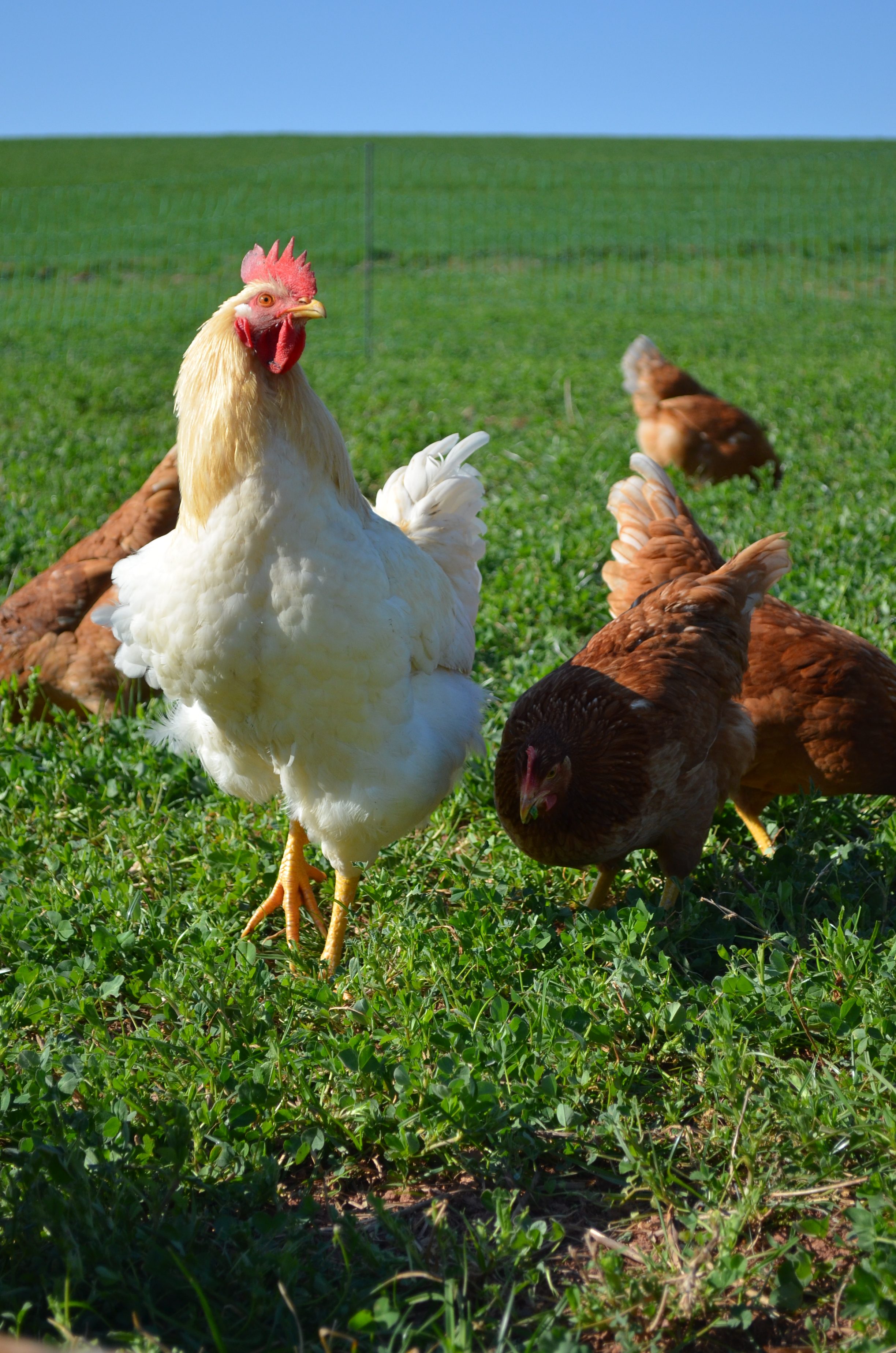 Seit Anfang März 2021 gibt es bei uns auf dem Betrieb auch zwei Mobilstall für Legehennen. In diesen leben insgesamt 460 Legehennen und 6 Hähne. Da die Mobile vollautake sind, können wir sie auf alle unsere Flächen stellen und somit passend in die Fruchtfolge integrieren. Der Auslauf wird ca. alle zwei Wochen neu eingezäunt, sodass die Hühner immer frisches Grün zu Verfügung haben. Damit wir unsere Hühner vor dem Habicht, Fuchs oder auch anderen Prädatoren schützen können, haben wir jeweils zwei Ziege mit im Auslauf, die die möglichen Angreifer vertreiben.